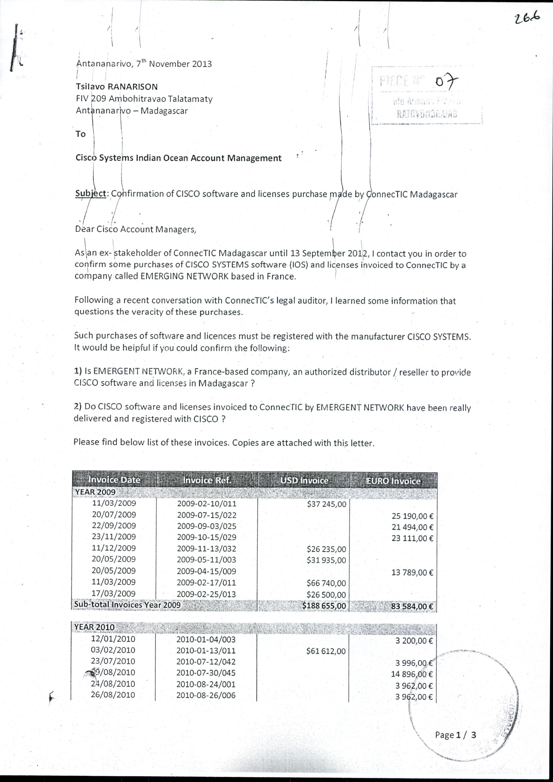 • Factures présentées : Les transactions étaient accompagnées de factures claires, listées dans une lettre envoyée par Ranarison à Cisco en novembre 2013.