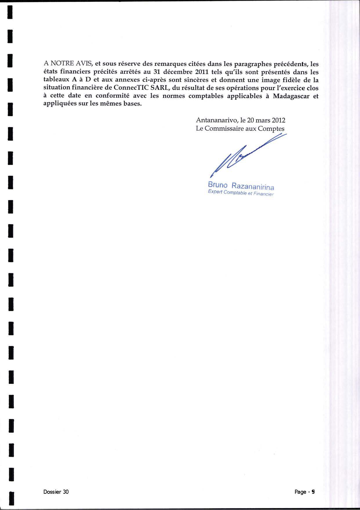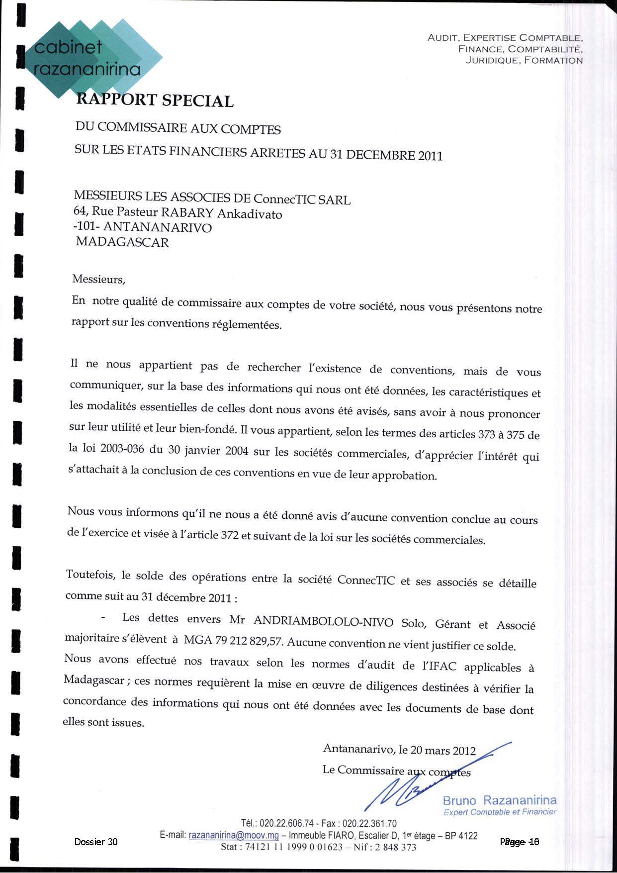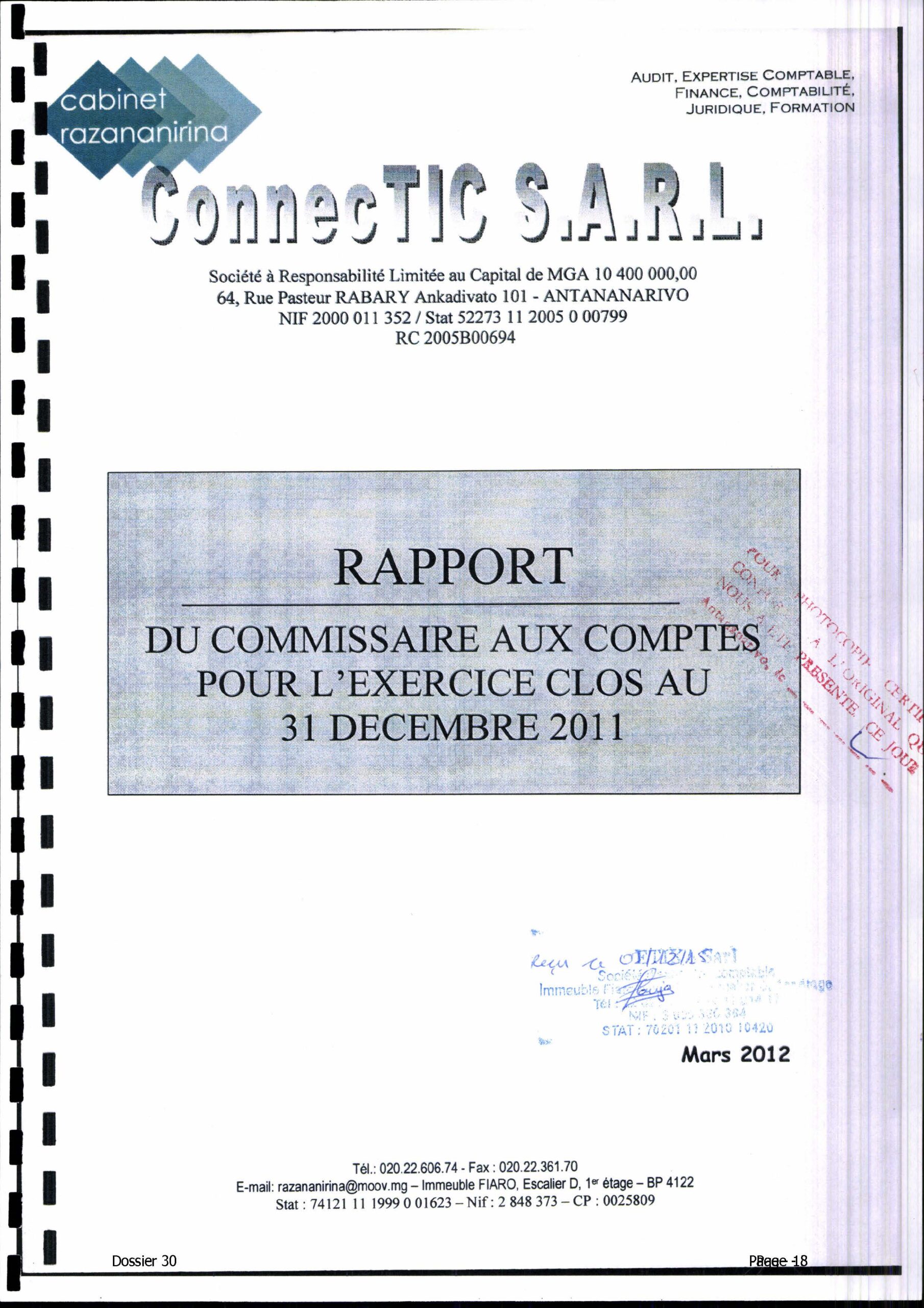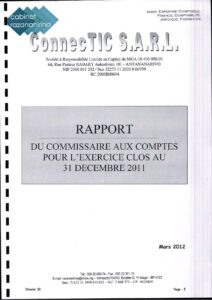 Le rapport officiel, daté du 20 mars 2012, analyse les comptes annuels de CONNECTIC pour l’exercice 2011. Contrairement aux affirmations de Ranarison Tsilavo :