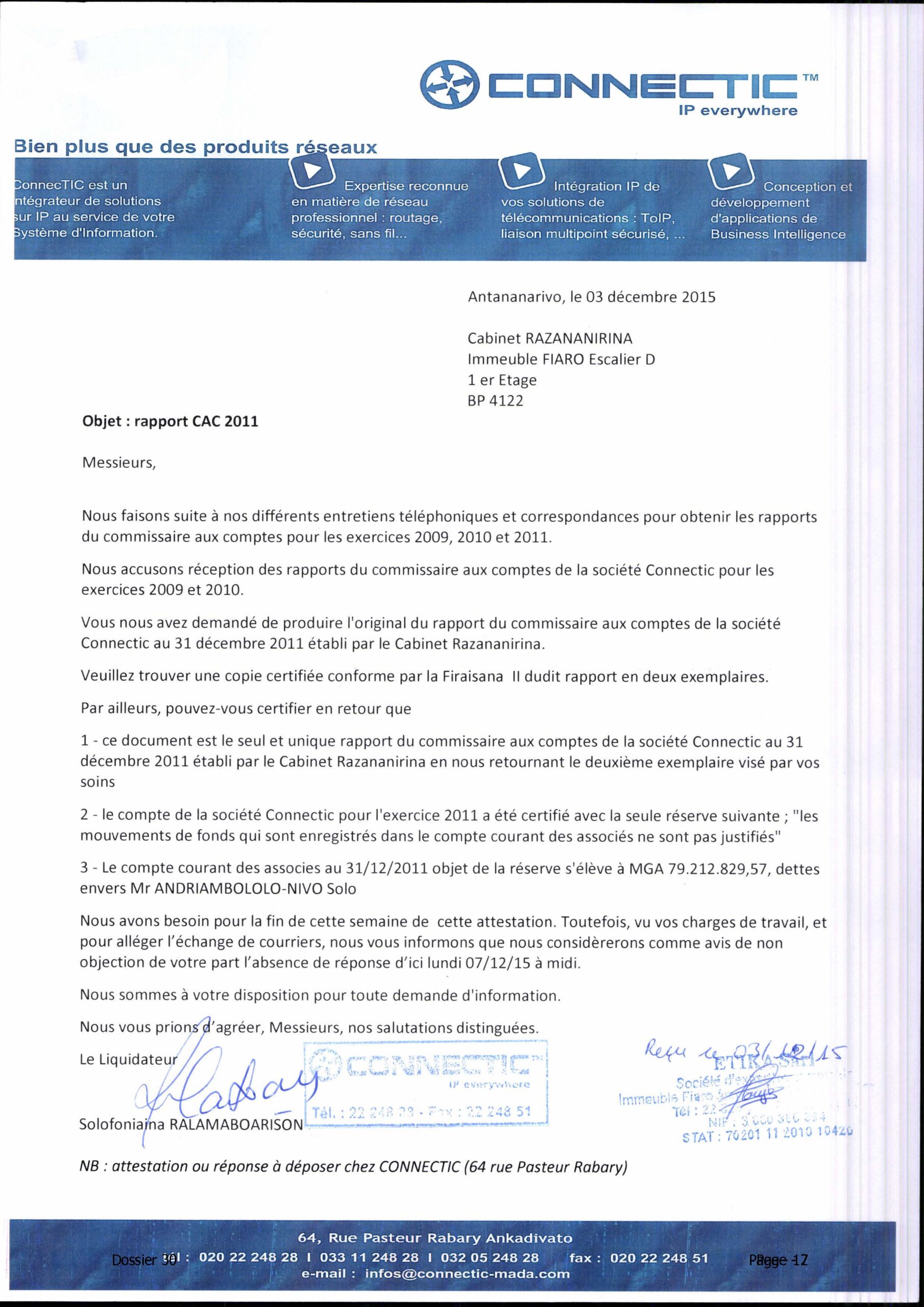 Dans sa plainte déposée en juillet 2015 contre Solo, gérant de CONNECTIC, Ranarison Tsilavo affirme que le rapport du commissaire aux comptes pour 2011, signé par le Cabinet Razananirina, contient des révélations graves : anomalies significatives, fraudes et détournements de biens sociaux.